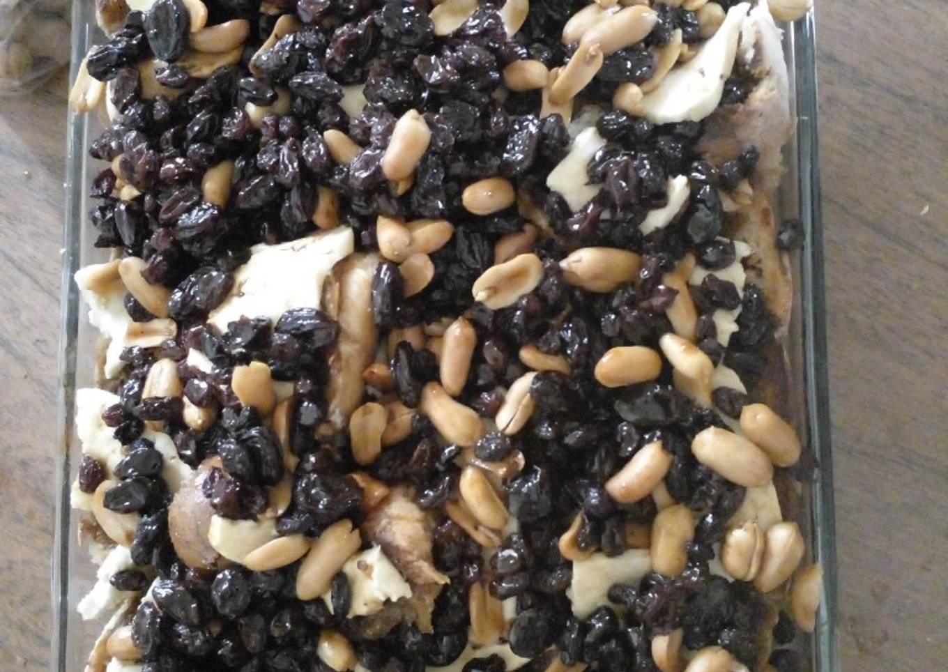- Luego, poner primero las pasas y cacahuates encima, por último la miel que se hizo con el piloncillo.