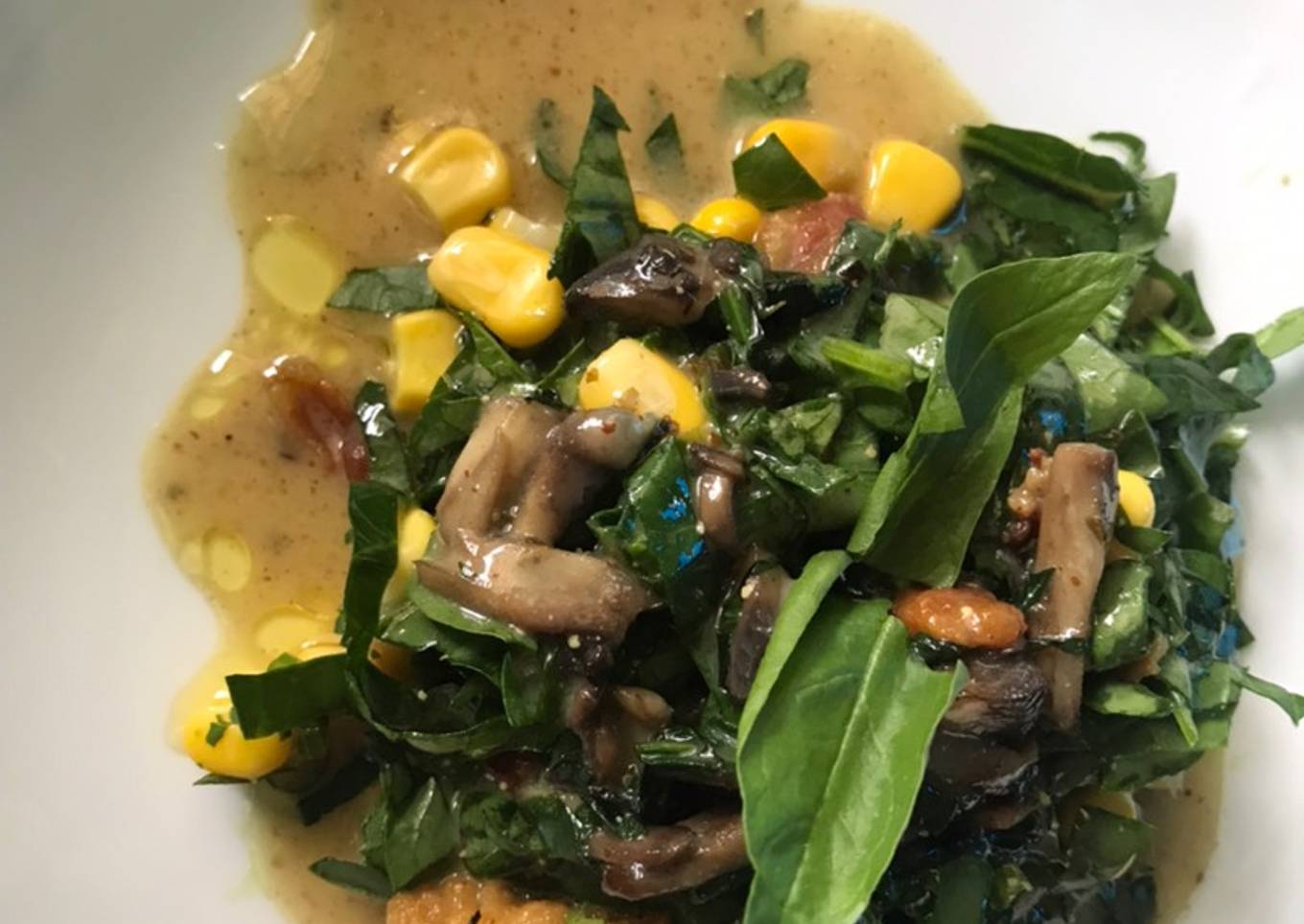 - Poner las hojas de espinacas en la ensalada. Agregarlo los elotes y mezclar, espolvorear el tocino crujiente.