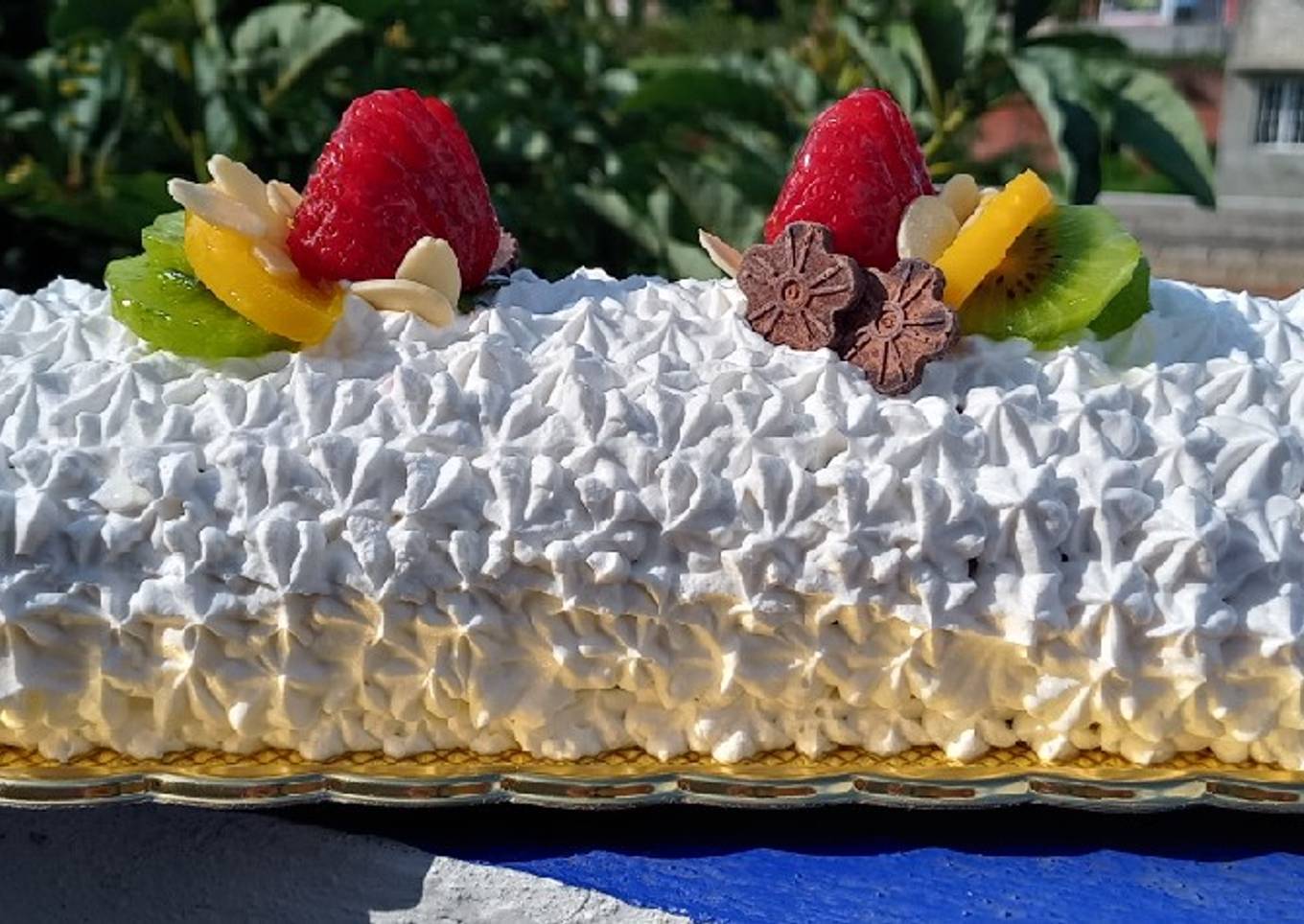- Preparar la crema para batir y una vez lista cubrir con una capa el bizcocho y colocar las frutas y almendras.