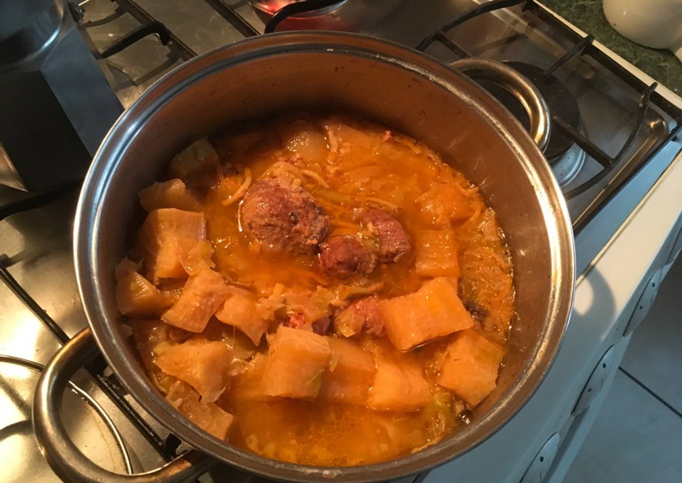 - Se vacía el cocido de carne en una olla de mayor tamaño con la col fileteada, el nabo en cuadritos de 1 cm, el chorizo y sal. Se cuece a fuego bajo por 1hr.
