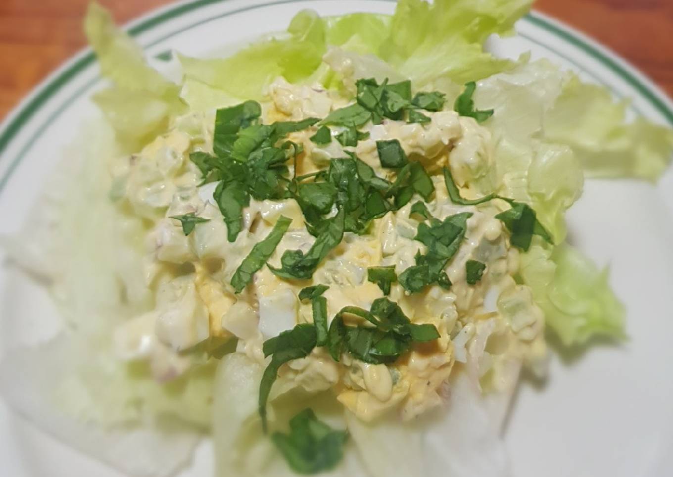 - Partir las hojas de lechuga a la mitad y acomodar las mitades una sobre la otra. Colocar la ensalada de huevo encima y adornar con la albahaca picada.