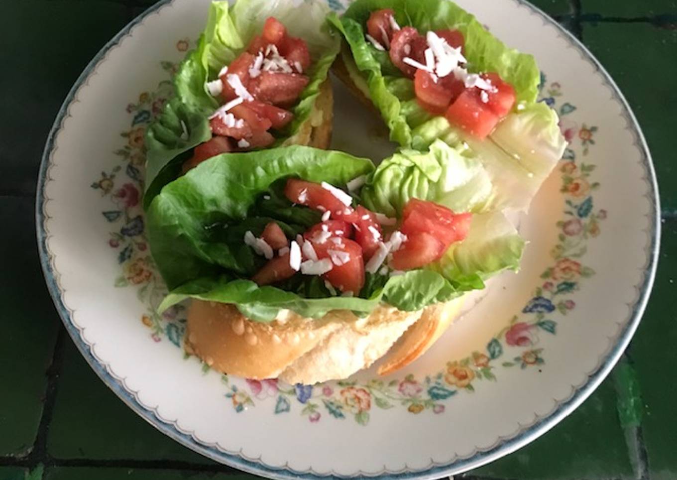 - Cortamos unas rebanadas de pan, confieso que siempre tengo bolillos y teleras congeladas, así que saco un bolillo y corto rebanadas en diagonal y las pongo a que se doren, les unto mayonesa, les pongo por encima una hoja de lechuga, jitomate con sal en pedacitos y encima unas 2 cucharaditas de vinagreta. Encima ponerles un poco de queso fresco rallado. Una delicia!