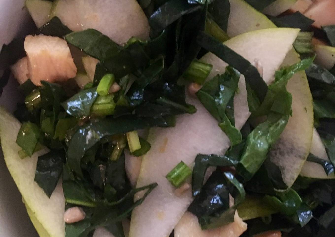 - Coloca en un plato hondo/bowl, la espinaca, las láminas de pera, la pechuga, y las semillas de girasol.