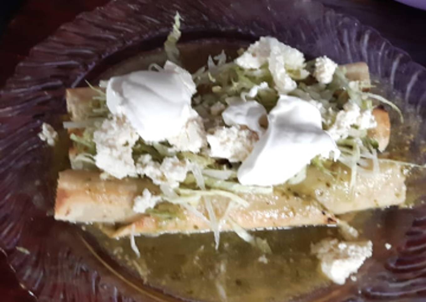 - En un plato llano se colocan 3 tacos y se bañan con la salsa verde, se les agrega la lechuga, queso (50 gr) y crema (25 gr aprox.)
