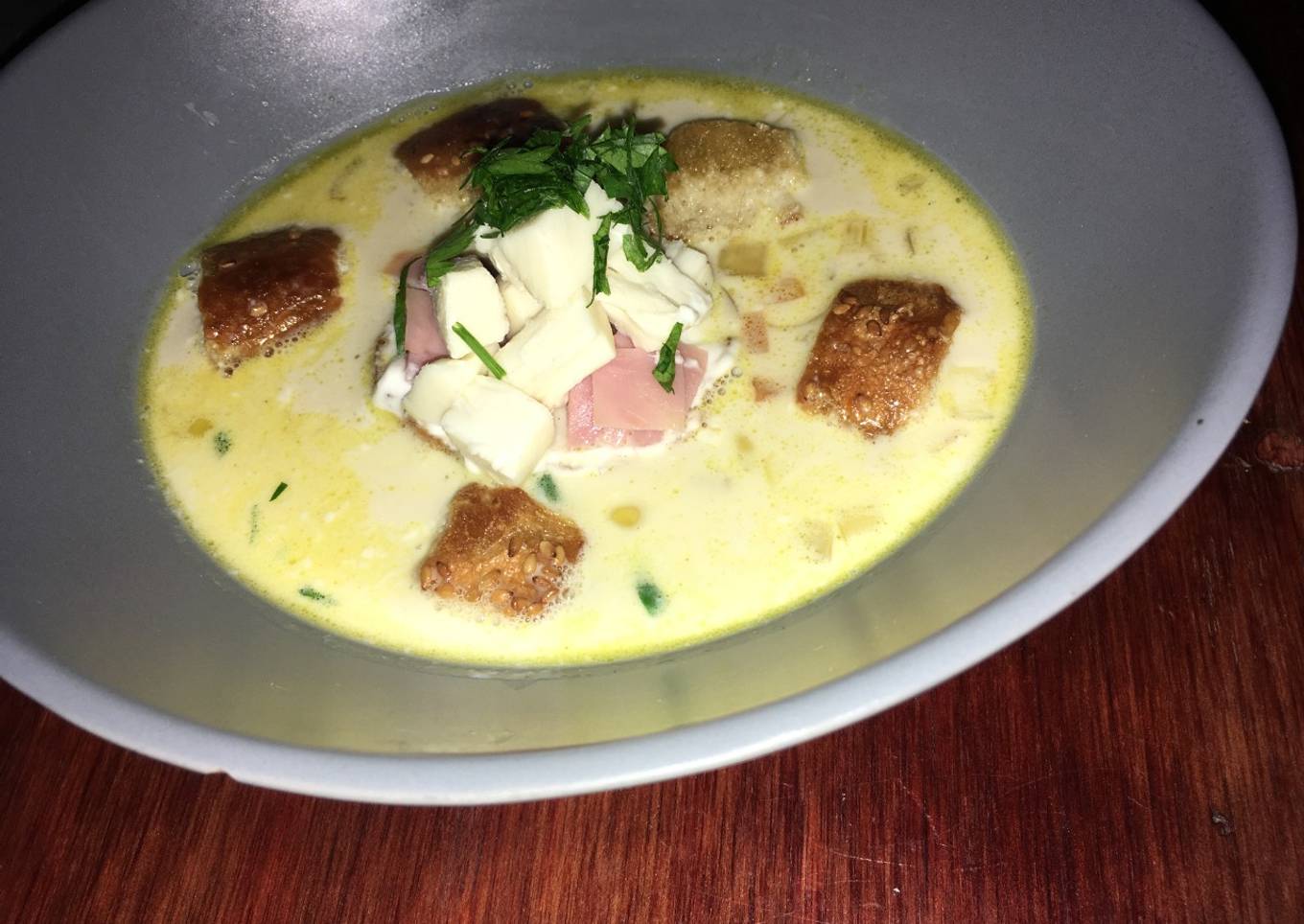 - Colocar en un tazón los crutones, queso, jamón, la mitad de crema y perejil picado.