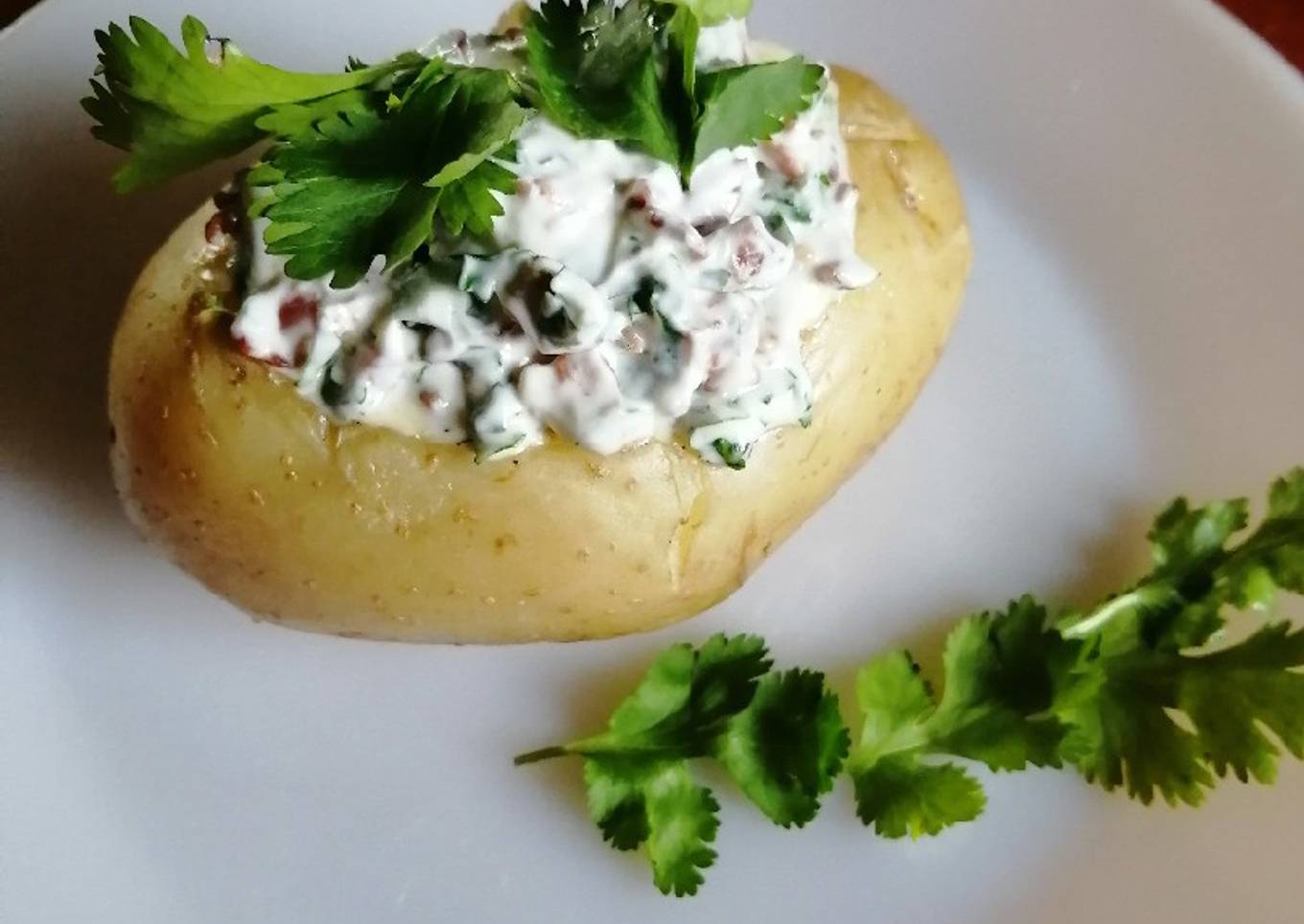 - Juntar la crema, el tocino y el cilantro y untarlas en suma de la papa