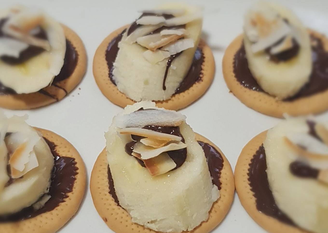 - Untar chocolate en cada galleta, poner una rebanada de plátano, un poco más de chocolate y decorar con hojuelas de coco. Si no tienes coco, puedes usar nuez, cacahuate o cualquier semilla. ¡Listo para disfrutar!