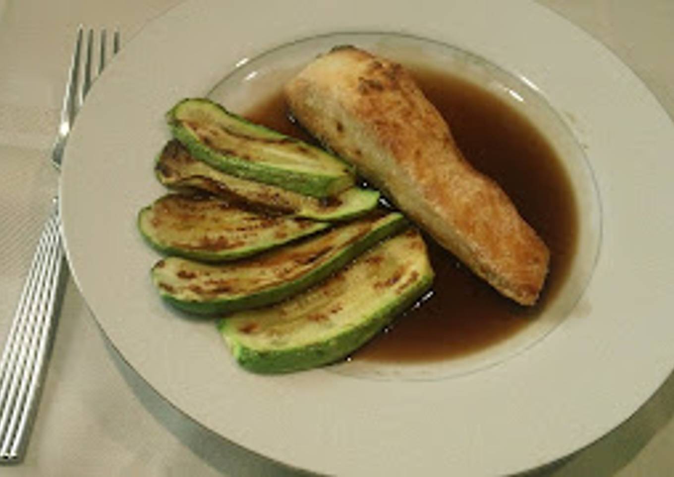 Se sirve la rebanada de salmón en el plato, sobre un espejo de la salsa Teriyaki y unas verduras asadas como hongos, cebolla en rebanadas, calabacitas, pimientos, brócoli.